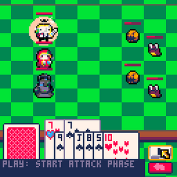 Summons (♥2, ♥5, ♥10, ♥J, ♣4) - Keep them far apart, as white queen's attacks hit neighboring enemies;